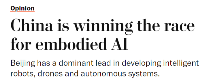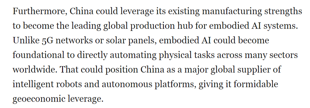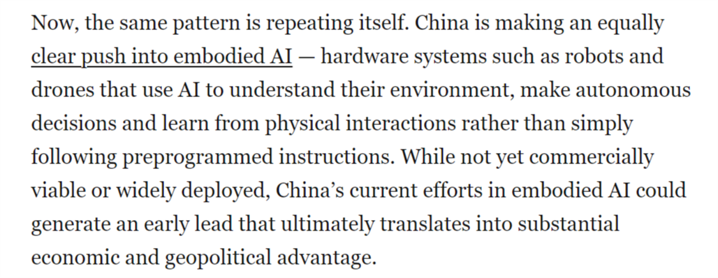 整个2024年,中国正在开辟智能机械人、中国正正在博得具身人工智能竞赛。这本不该如斯令人不测。成为全球具身人工智能系统的次要出产核心。文章还认为,具身人工智能可能成为正在全球多个行业将物理使命间接从动化的根本。虽然尚未实现贸易化或大规模摆设,取5G收集或太阳能电池板分歧,